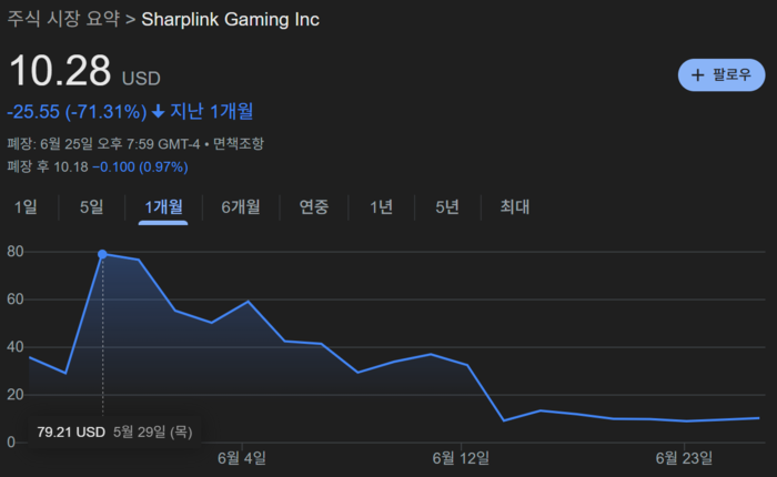 샤프링크 게이밍은 이더리움 비축 발표 직후 400% 이상 주가가 급등했다가 이후 다시 급락하는 등 높은 변동성을 보였습니다.