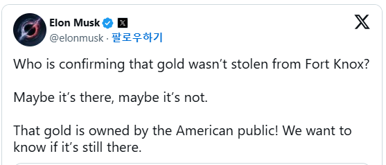 미국 정부효율부 (DOGE)를 이끌고 있는 일론 머스크는 지난달 17일 자신의 X 계정에서 포트 녹스에 실제 금이 있는가 하는 의문을 제기했습니다.