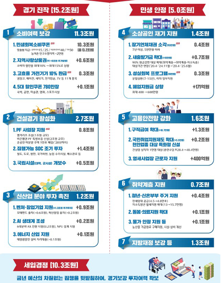 "소비 진작, 민생 안정, 미래 투자"를 한 예산 안에서 담아내며 정책의 통합성과 전략성을 갖춘 예산으로 평가됩니다.