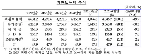 한국은행이 발표한 2025년 4월 외환보유액은 4046억 7000만 달러.